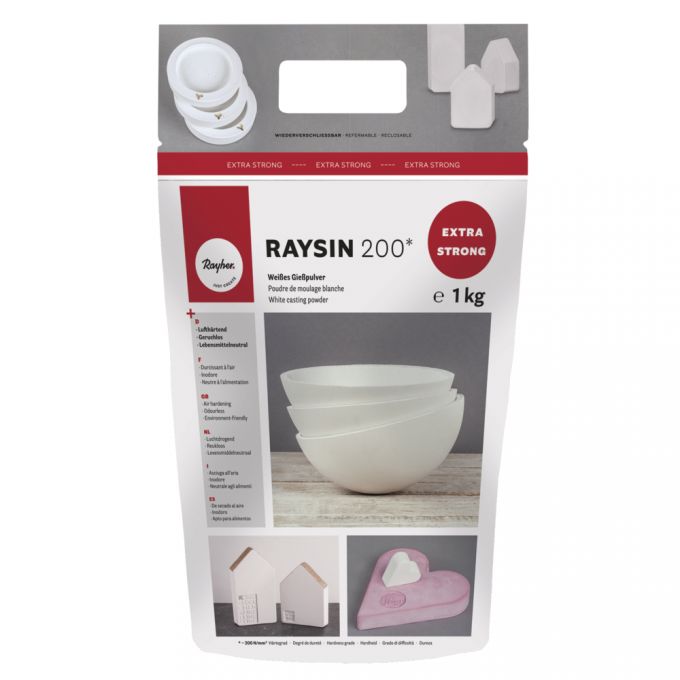 O pó de moldagem “Raysin” é inodoro e neutro do ponto de vista alimentar, simplesmente endurece em contacto com o ar. É branco e vendido em um saco de um quilo. A massa de fundição é de boa qualidade e é particularmente indicada para a fundição de objetos como relevos, figuras, relevos, azulejos, azulejos, mosaicos, painéis decorativos, ornamentos, etc. Um produto muito bom com uma superfície lisa, ideal para DIYers exigentes.